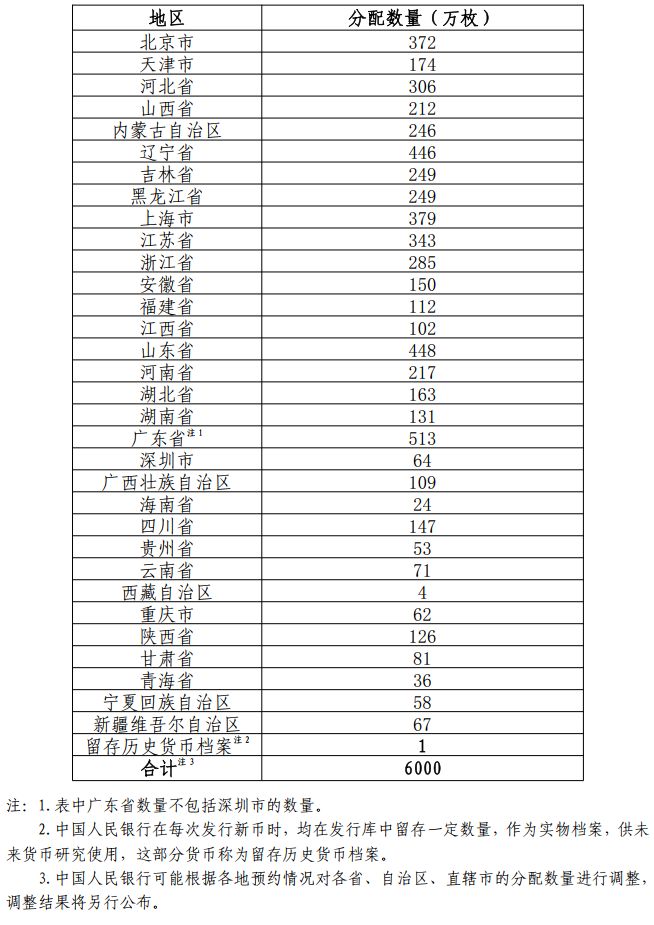 中国京剧艺术普通纪念币面额为5元,直径为30毫米,材质为黄铜合金,发行数量为6000万枚。各省、自治区、直辖市分配数量如下: