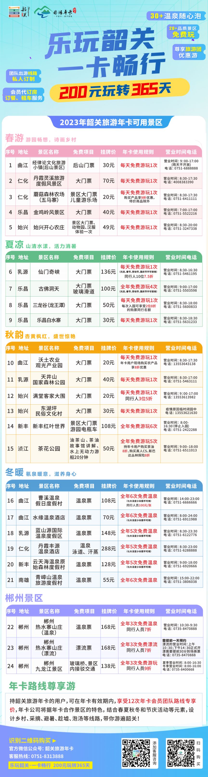 韶关旅游年卡是一种集旅游、休闲、娱乐为一体的综合性旅游年票,持卡人可在有效期内免费游览韶关市内及部分周边地区的景区、景点。此卡为年度旅行必备攻略,让您畅游韶关,一卡在手,说走就走!